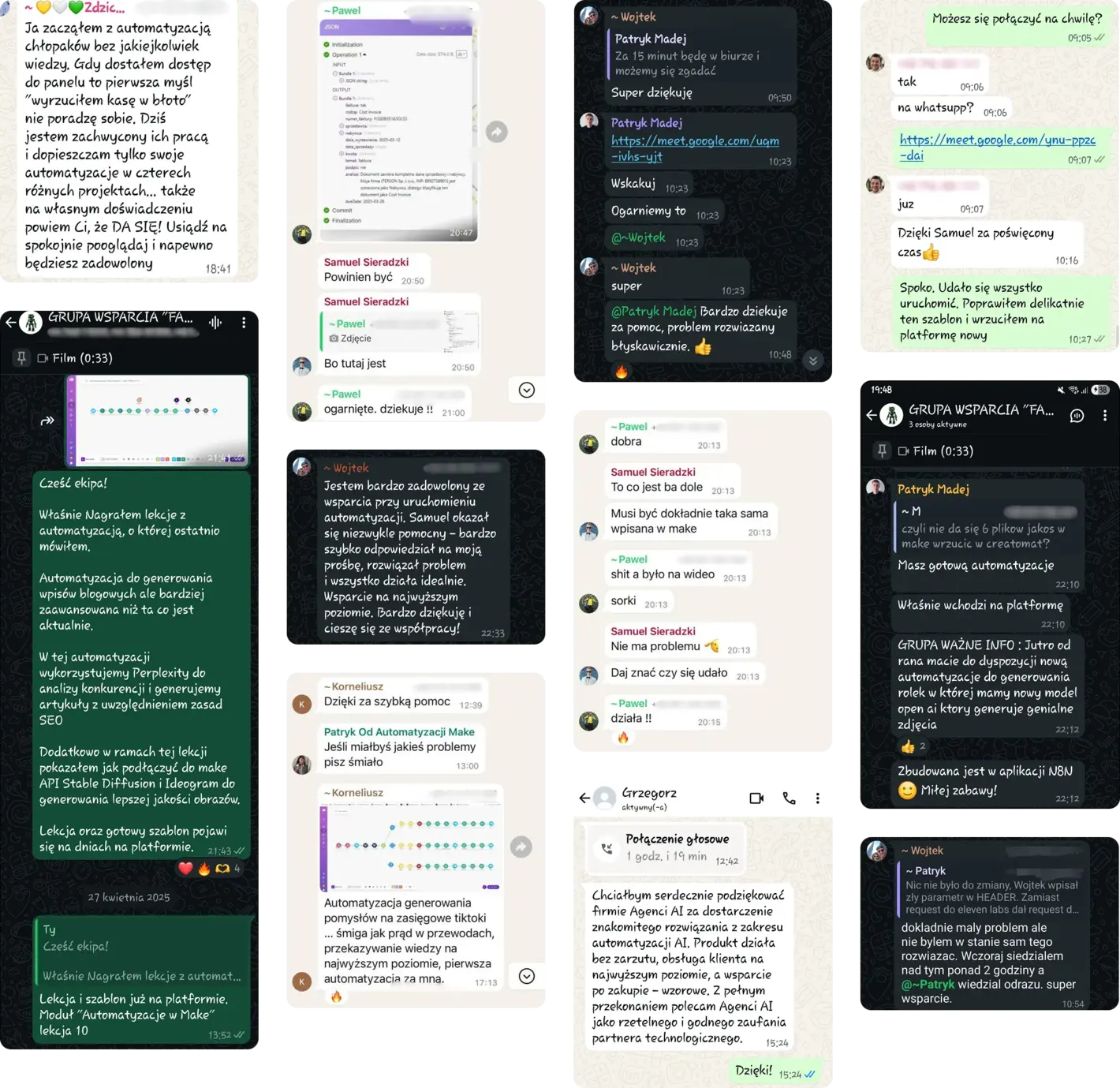 Na grupie wsparcia jest świetna atmosfera i ekspresowa pomoc – niezależnie od poziomu zaawansowania, zawsze można liczyć na konkretną, merytoryczną odpowiedź. Ekipa agenci.ai naprawdę zna się na rzeczy i potrafi dzielić się wiedzą w sposób przystępny i efektywny. Czujemy, że mamy obok siebie partnerów, którym zależy na naszym sukcesie.